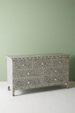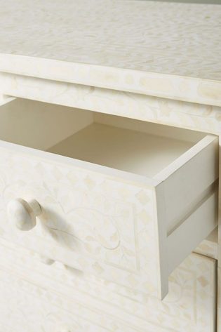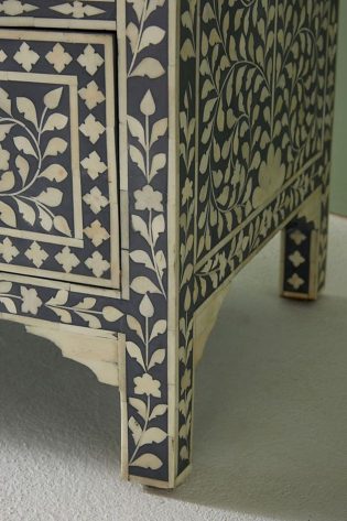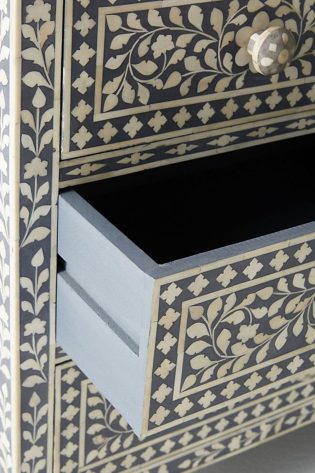Add elegance, practicality, and timeless style to your living space with this handmade Arctic bone inlay chest of drawers. Its detailed inlay, bohemian-inspired indigo and white pattern, and durable construction make it an essential piece of bone inlay furniture for any home.
