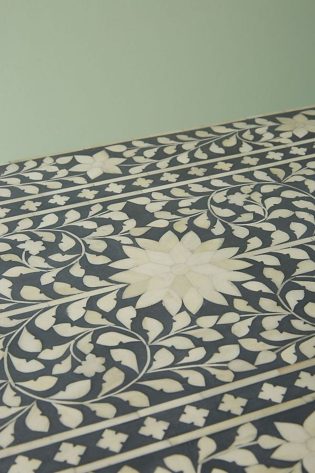 The soothing indigo and white palette complements both modern and traditional interiors. Its relaxed bohemian design creates a calm and inviting atmosphere. Combined with the intricate bone inlay detailing, this chest serves as a sophisticated centerpiece that enhances any room’s décor.