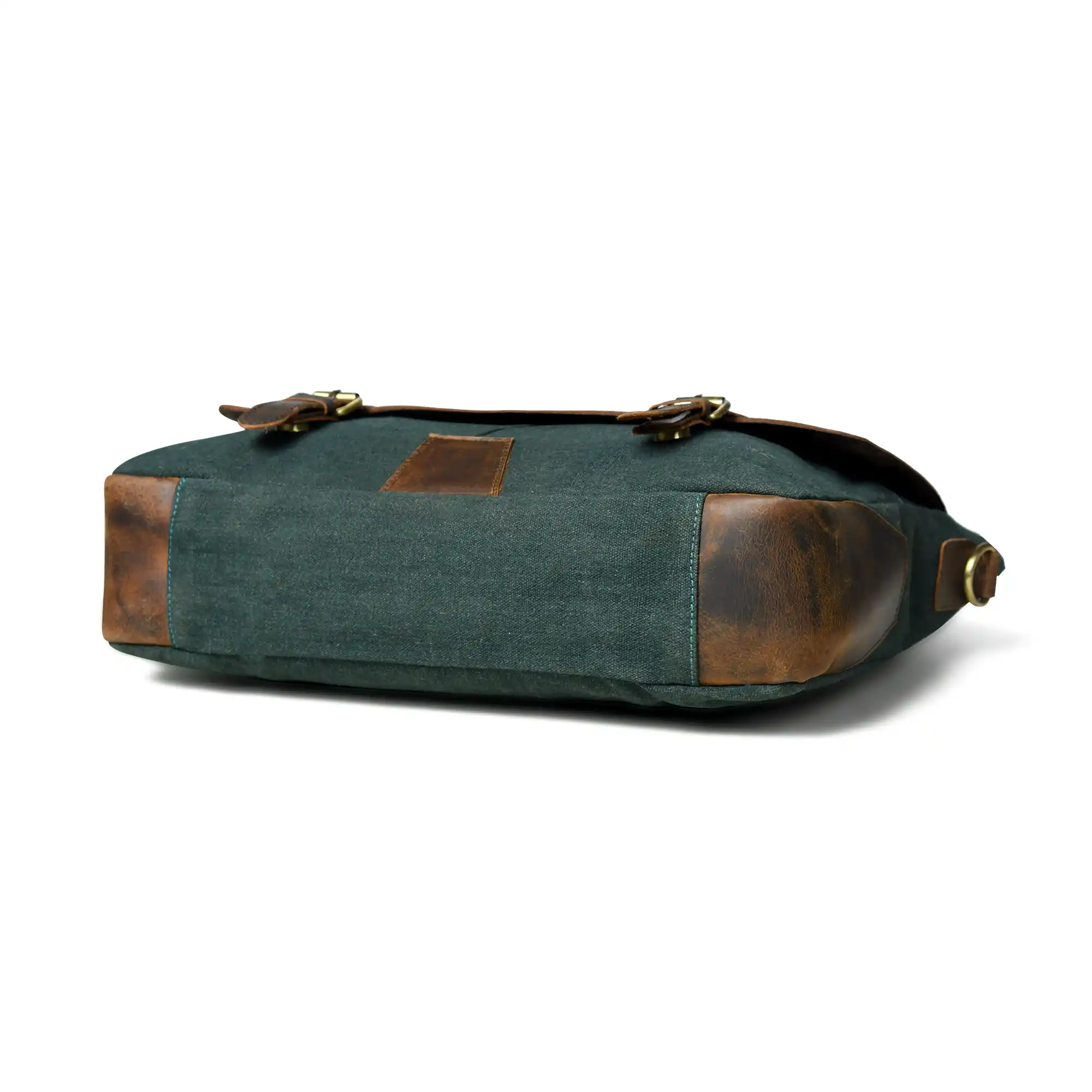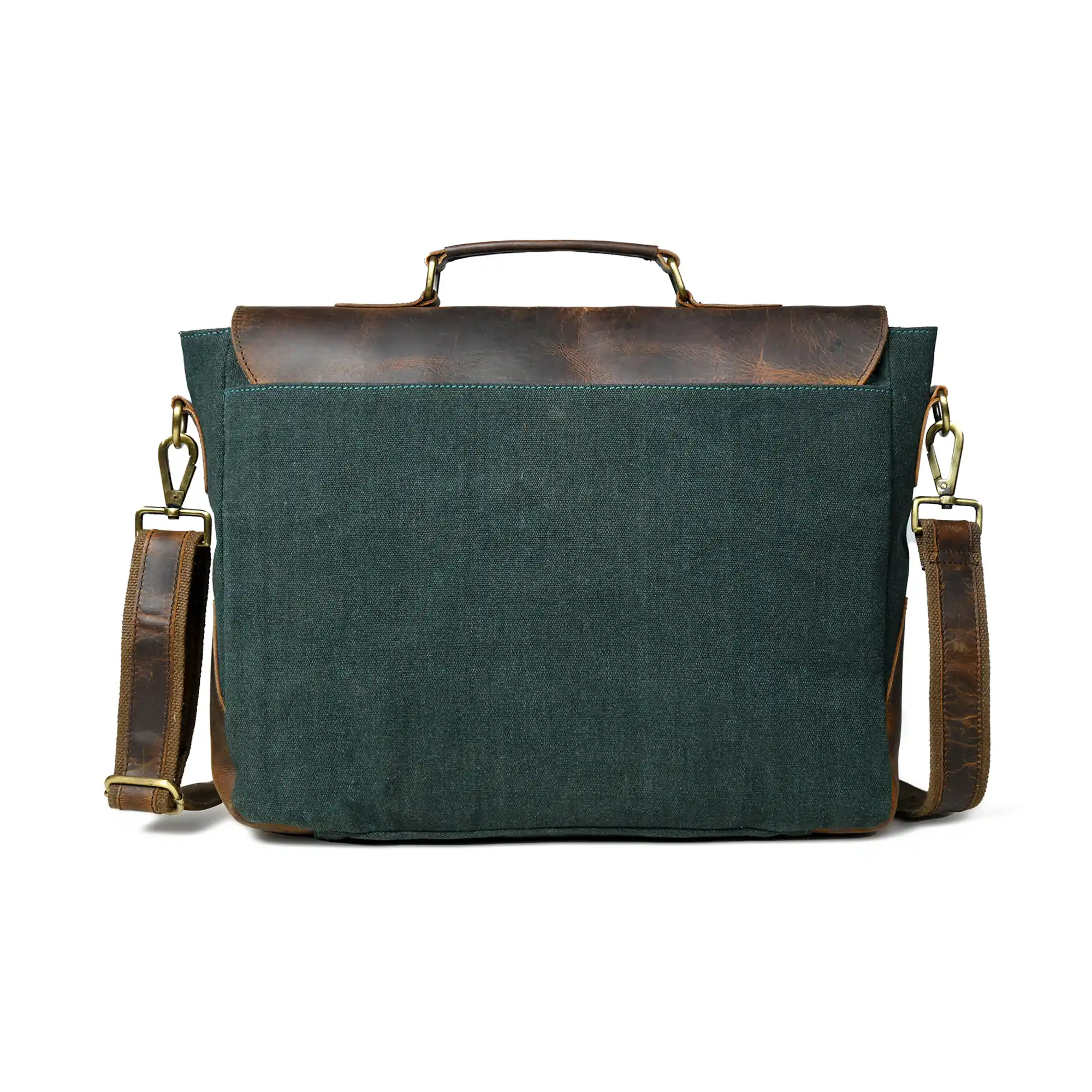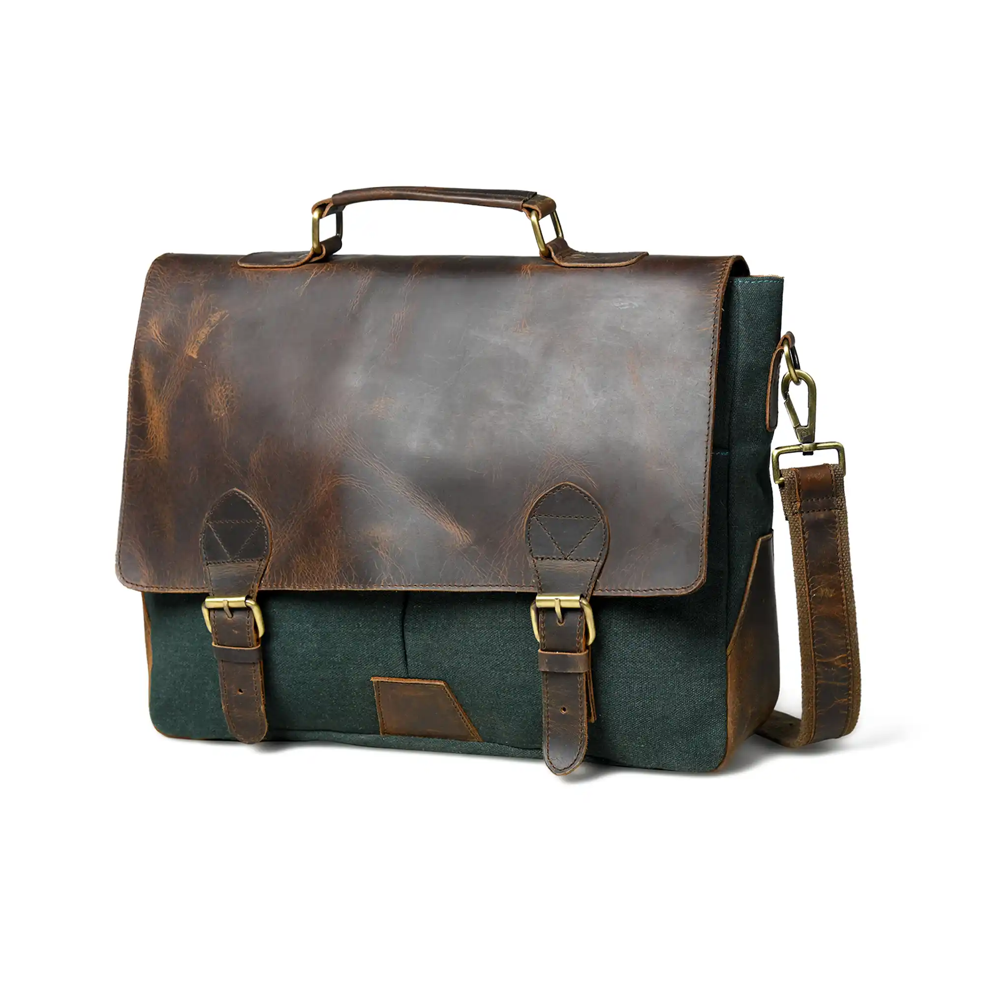A refined half-flap messenger bag designed for the modern professional. Crafted from high-quality genuine leather with a distressed finish and durable canvas, it features a secure zippered main compartment, dual front pockets, and brass-tone buckle closures. Inside, a fully lined interior offers a dedicated sleeve for your laptop or documents. Complete with a detachable leather shoulder strap and padded comfort support, plus a sturdy leather handle for versatile carry.